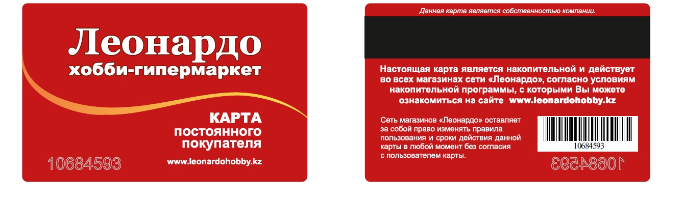 Карты Постоянного покупателя, полученные в Казахстане, недействительны в хобби-гипермаркетах "Леонардо" России и Беларуси.