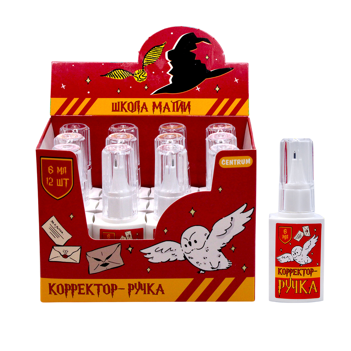 Корректор-ручка Школа магии в оригинальном исполнении. Быстросохнущая с металлическим корректирующим узлом. Незаменимый помощник в учебе и для тех, кто имеет дело с бумажными носителями. Данное средство отлично справляется с корректировкой рукописных и печатных текстов. Ручка позволяет аккуратно закрашивать отдельные буквы, символы и цифры. При нанесении не растекается и не отпечатывается на обратной стороне. Имея высокую кроющую способность, корректирующая жидкость без труда перекрывает чернила любой плотности и цветов. Скорректированная область имеет насыщенный белый цвет, не выцветает и не желтеет, оставаясь неизменной по истечении длительного времени. Для предотвращения высыхания и застаивания корректирующей жидкости, флакон необходимо встряхивать перед использованием. Объем - 6 мл. Упаковка - картонный стенд.