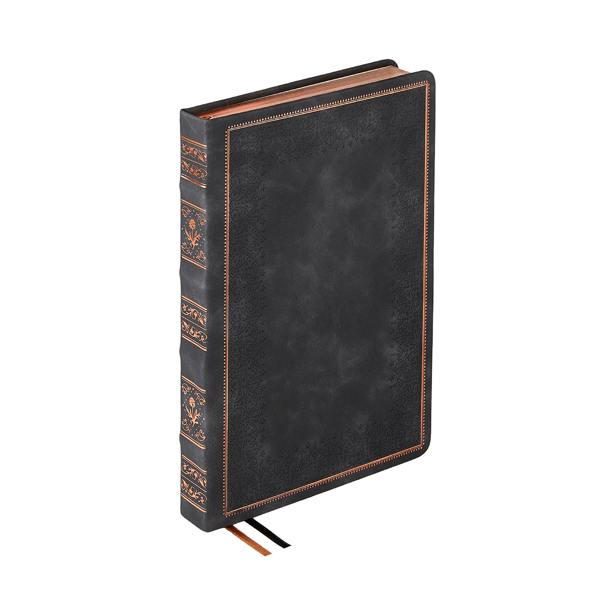 Недатированный ежедневник "ROYAL" формата А5 с твердой обложкой из искусственной кожи с имитацией нубука украшен художественным бронзовым и блинтовым тиснением. Внутри 256 страниц, выполненных из качественной бежевой бумаги в линейку плотностью 100 г/м?. Два шелковых ляссе в цвет обреза блока и обложки облегчают навигацию по записям. Французский корешок дополнительно декорирован изящным бронзовым тиснением в виде виньеток. Скругленные углы обложки и блока подчеркивают стильный дизайн изделия, а блеск бронзового обреза дарит ежедневнику благородный и роскошный внешний вид.