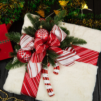 Мы использовали мягкий плюш, искусственные еловые ветки, ленты и ёлочные шары, создав объёмную композицию, напоминающую настоящий сюрприз от Деда Мороза.
