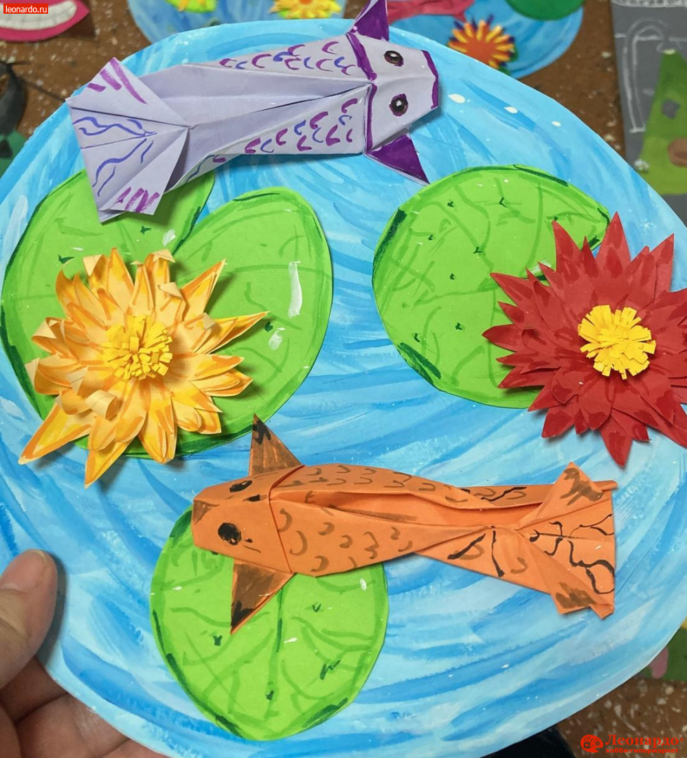 Жұмыс аппликация және оригами техникасында орындалған. Көл бейнесі аясында түрлі-түсті қағаздан жасалған жарқын балықтар тұңғиықтарды қоршап, табиғаттың сиқыры мен тыныштығын сезіндіреді. Композиция балалардың қиялын, ұсақ моторикасын және шығармашылық ойлауын дамытады.