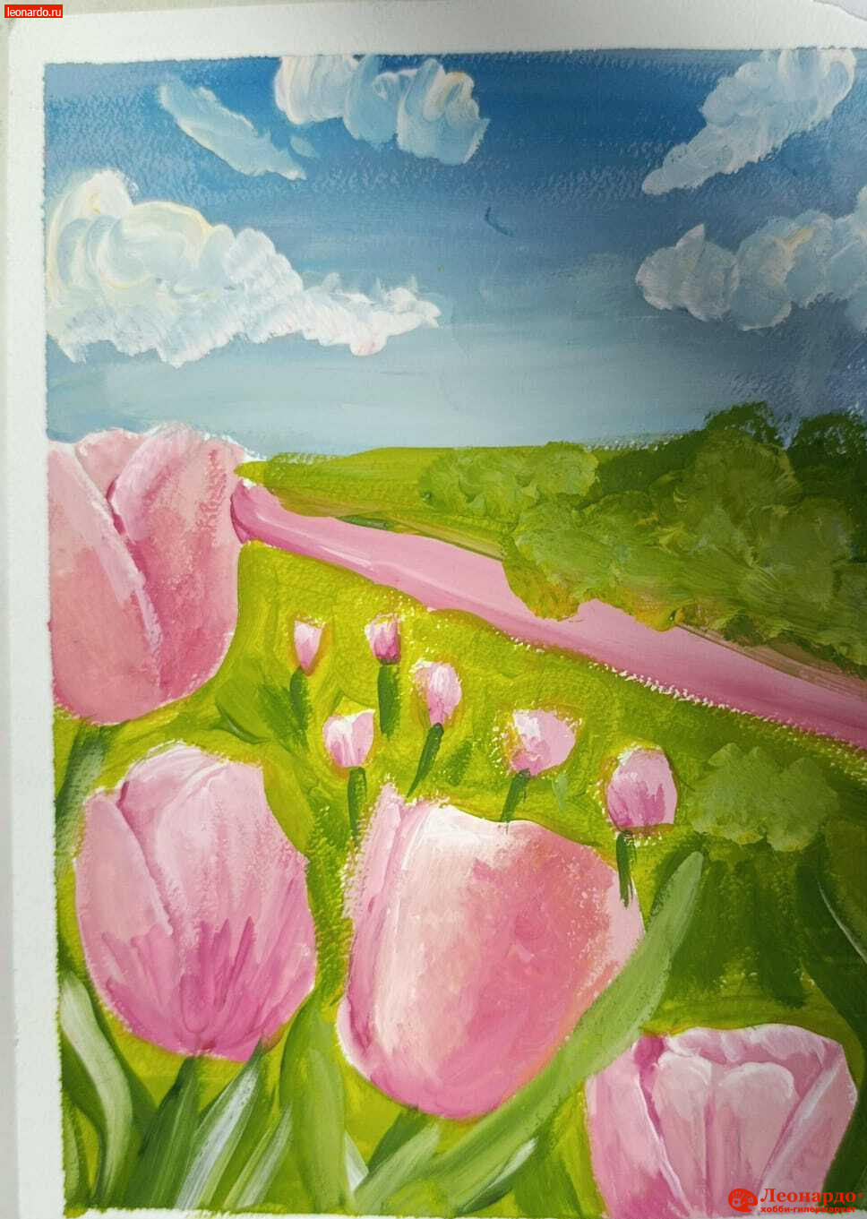 Бұл картина жылы көктем күнінің көңіл күйін жеткізеді. Алдыңғы планда жұмсақ, еркін қылқалам іздерімен салынған ірі қызғылт қызғалдақтар бейнеленген. Олардың нәзік түсі қанық жасыл шөп пен жапырақтармен әдемі үйлесіп, сергектік пен өсіп-өну әсерін береді.